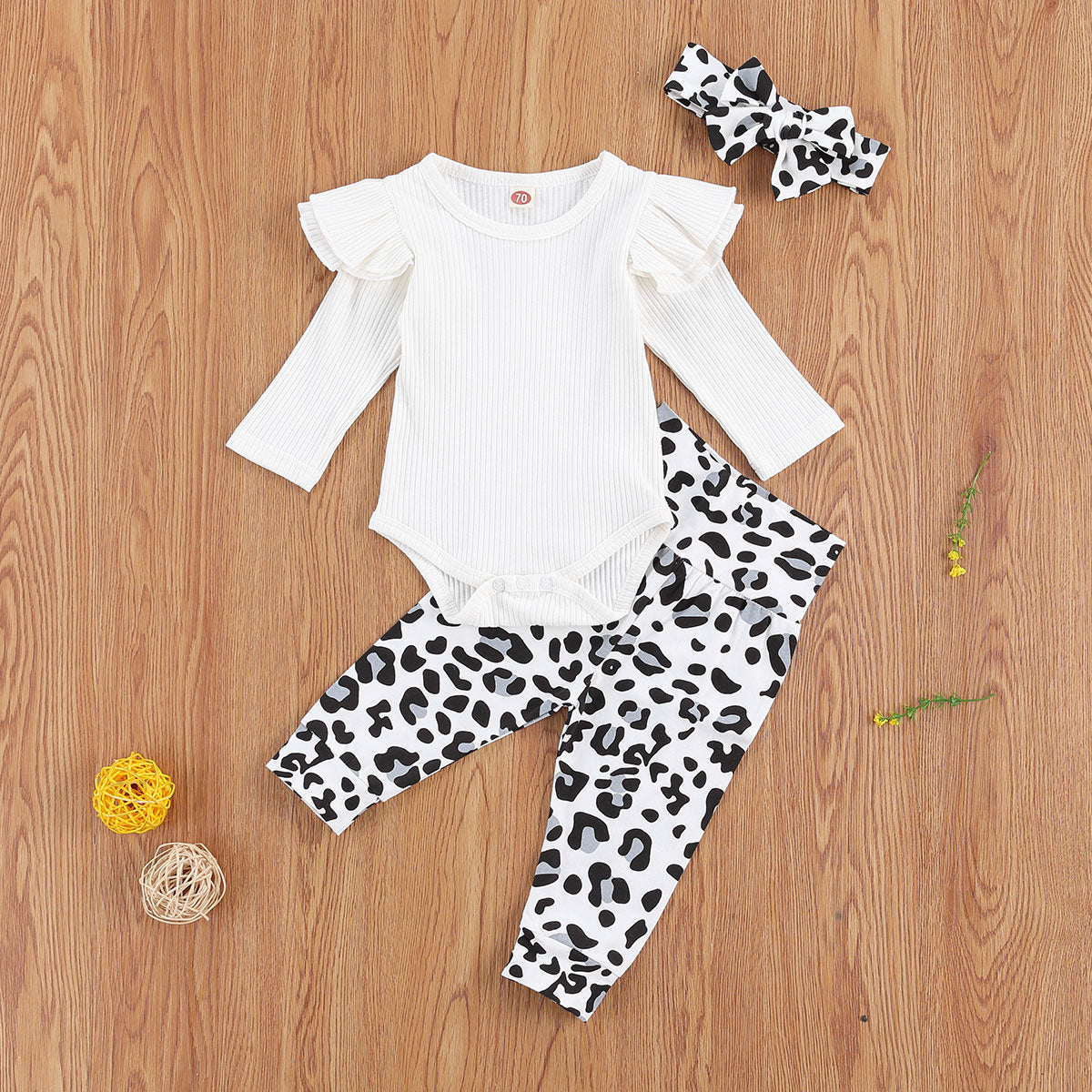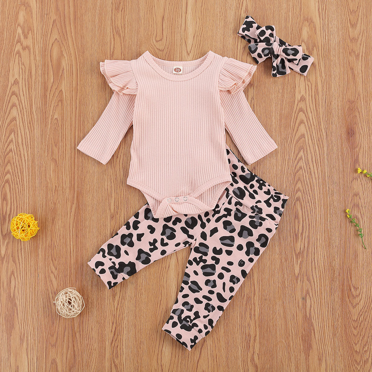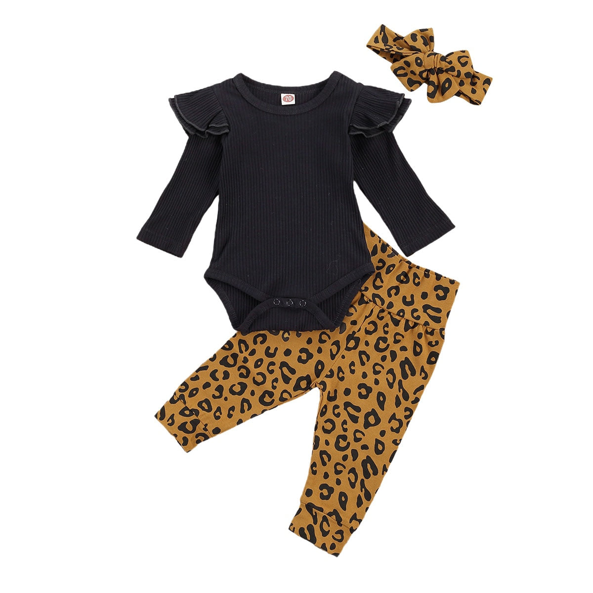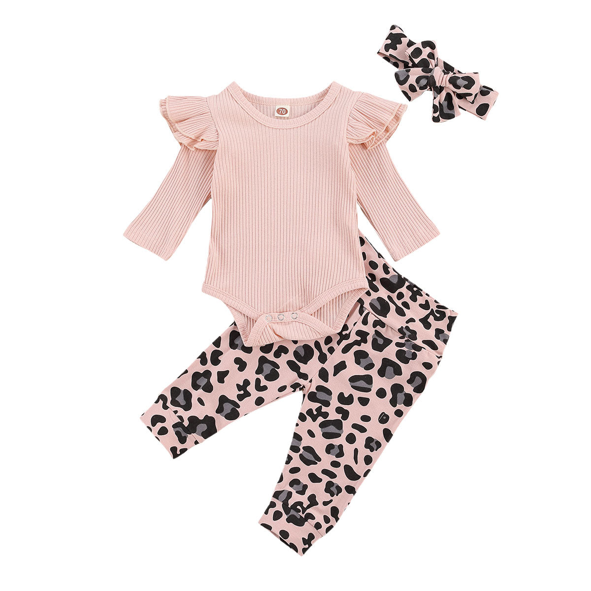 Newborn 3Pcs - Adorable Solid Color Flying Sleeve Onesie, Leopard Trousers, And Headband